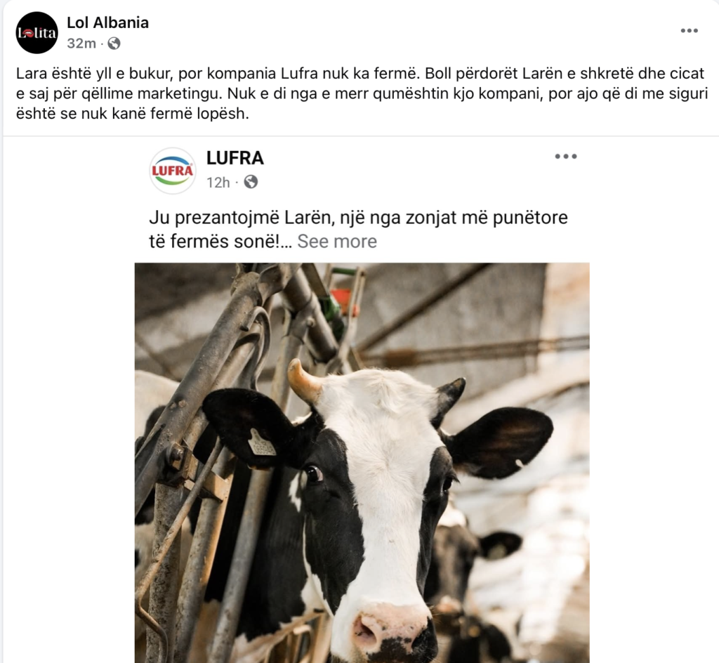 Reagimi nuk u shpërfill. Në një koment të gjatë dhe të argumentuar, vetë “Lufra” u përgjigj publikisht duke pranuar se nuk ka një fermë të vetën, por theksoi se bashkëpunon me më shumë se 450 fermerë të licencuar në Shqipëri, përfshirë “Fermën Demiri”, ku ndodhet edhe “Lara”.